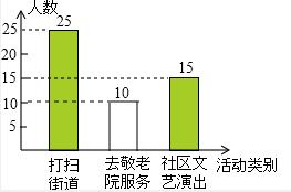 (2)用总人数减去打扫街道和去社区文艺演出的人数,求出去敬老院服务的学生数,即可补全统计图;