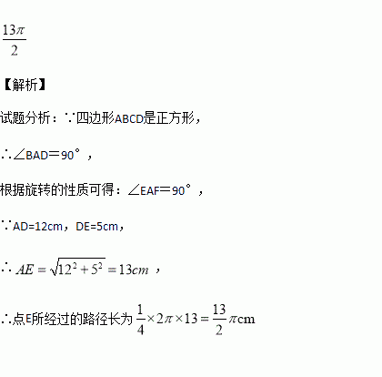 已知正方形ABCD的边长为12cm,E为CD边上一点,DE=5cm.以点A为中心,将△ADE按顺时针方向旋转得△ABF,则点E所经过的路径长为___________cm.