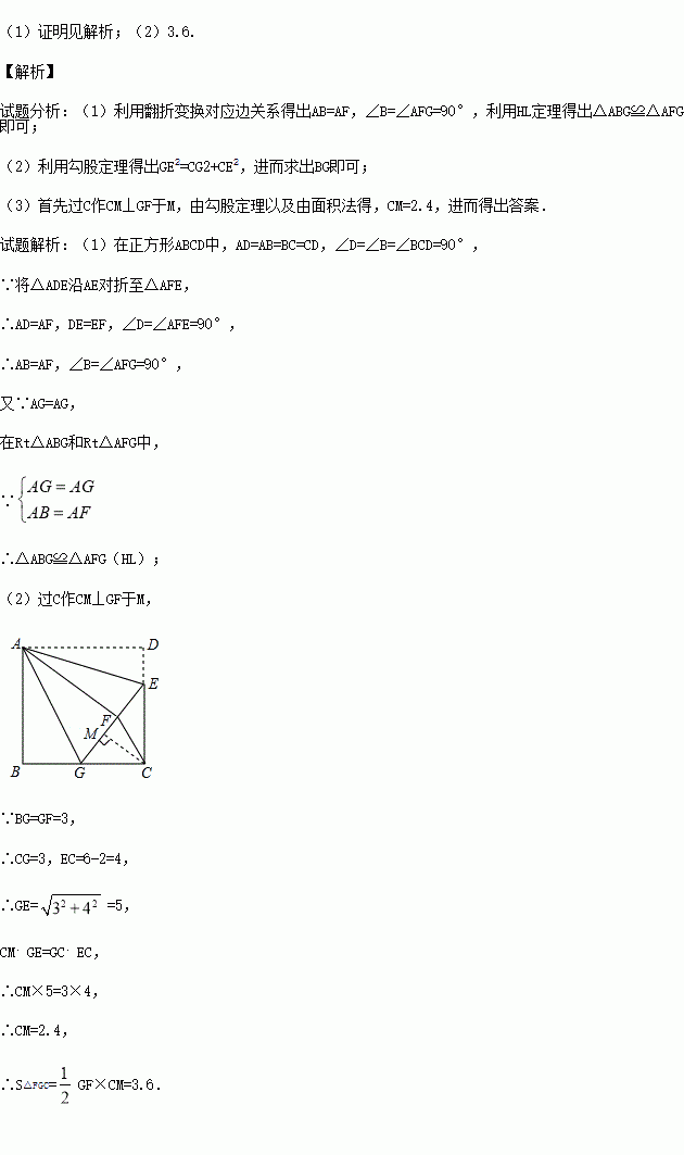 如图,正方形ABCD中,AB=6,点E在边CD上,且CD=3DE.将△ADE 沿AE对折至△AFE,延长EF交边BC于点G,连接AG,CF.