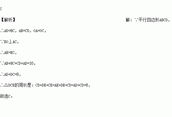 如图,□ABCD的周长为16cm,AC、BD相交于点O,OE⊥AC交AD于E,则△DCE的周长为