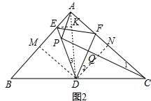 分析 (1)连接AD,过D作DM⊥AB于M,DN⊥EF于N,DK⊥AC于K,根据等腰三角形的性质得到AD平分∠BAC,由角平分线的性质得到DM=DK,DM=DN,等量代换得到DM=DN=DK,于是得到DF平分∠EFC,根据三角形的内角和即可得到结论;