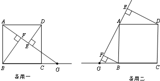 (2)当点G在BC延长线上时(备用图一),作出对应图形,问:线段AF、BF、EF之间有什么关系(只写结论,不要求证明)?
