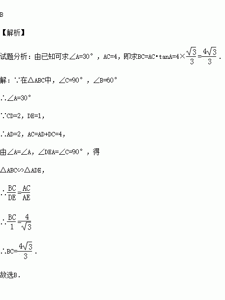 (2009•恩施州)如图,在△ABC中,∠C=90°,∠B=60°,D是AC上一点,DE⊥AB于E,且CD=2,DE=1,则BC的长为( )