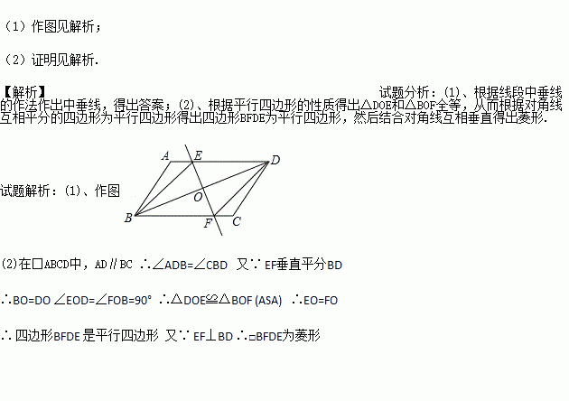 (1)用直尺和圆规作出对角线BD的垂直平分线交AD于点E,交BC于点F,垂足为O.(保留作图痕迹,不要求写作法)