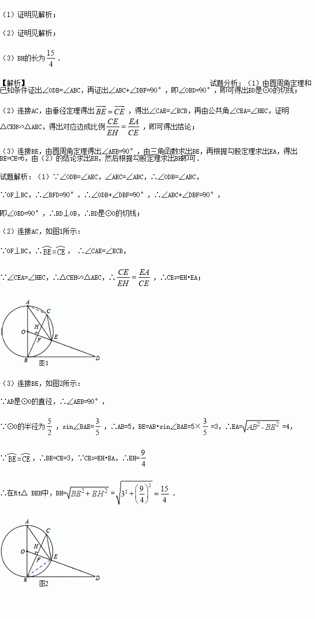 已知,如图,AB是⊙O的直径,点C为⊙O上一点,OF⊥BC于点F,交⊙O于点E,AE与BC交于点H,点D为OE的延长线上一点,且∠ODB=∠AEC.