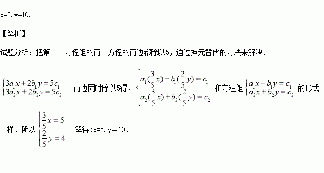 的解.”提出各自的想法。甲说:“这个题目好象条件不够,不能求解”;乙说:“它们的系数有一定的规律,可以试试”;丙说:“能不能把第二个方程组的两个方程的两边都除以5,通过换元替换的方法来解决”.参考他们的讨论,你认为这个题目的解应该是 .