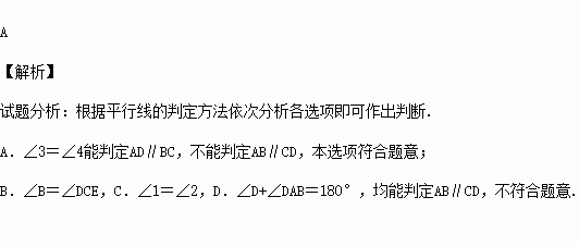 A.∠3=∠4. B.∠B=∠DCE. C.∠1=∠2. D.∠D+∠DAB=180°.