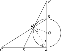 分析:(1)连接OD、AD,求出CDA=∠BDA=90°,求出∠1=∠4,∠2=∠3,推出∠4+∠3=∠1+∠2=90°,根据切线的判定推出即可;