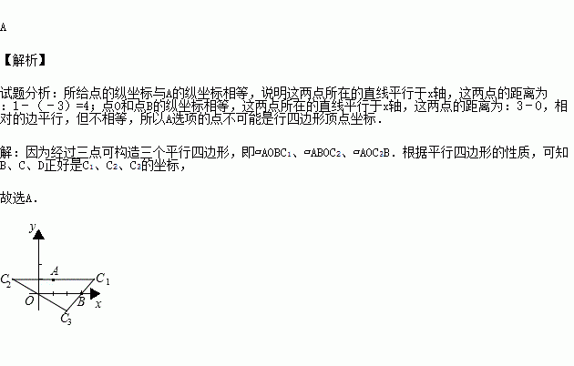 (2010•丹东)如图,在平面直角坐标系中,以O(0,0),A(1,1),B(3,0)为顶点,构造平行四边形,下列各点中不能作为平行四边形顶点坐标的是( )