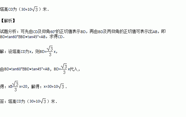 瞭望台AB高20m,从瞭望台底部B测得对面塔顶C的仰角为60°,从瞭望台顶部A测得塔顶C的仰角为45°,已知瞭望台与塔CD地势高低相同.求塔高CD.