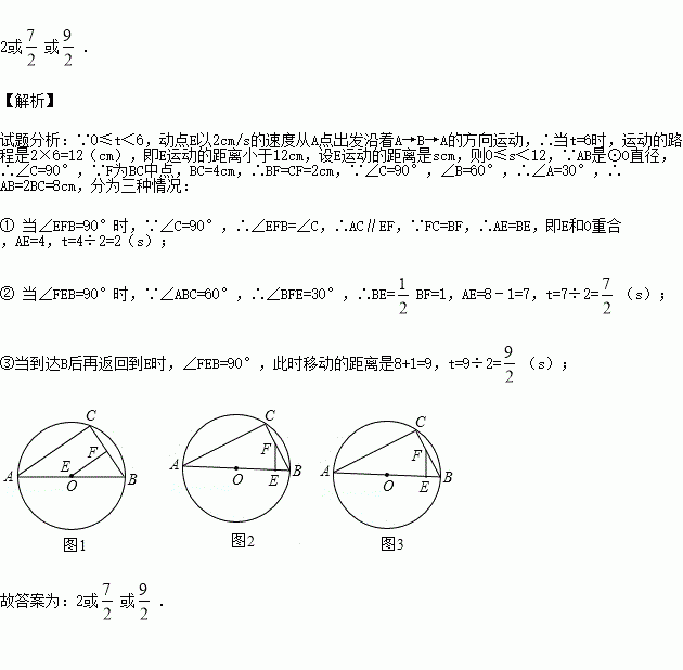 中点,∠ABC=60°.若动点E以2cm/s的速度从A点出发沿着A→B→A的方向运动,设运动时间为t(s)(0≤t<6),连接EF,当△BEF是直角三角形时,t的值为____