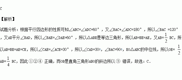 如图□ABCD的对角线AC,BD交于点O,AE平分∠BAD交BC于点E,且∠ADC=600,AB=