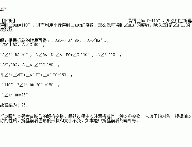 如图,梯形ABCD中,AD∥BC,DC⊥BC,将梯形沿对角线BD折叠,点A恰好落在DC边上的点E处,若∠EBC=20°,则∠EBD的度数为_________.