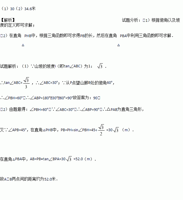 (1)山坡坡角(即∠ABC)的度数等于 度;