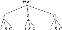 在毕业晚会上,同学们表演哪一类型的节目由自己摸球来决定.在一个不透明的口袋中,装有除标号外其它完全相同的A、B、C三个小球,表演节目前,先从袋中摸球一次(摸球后又放回袋中),如果摸到的是A球,则表演唱歌;如果摸到的是B球,则表演跳舞;如果摸到的是C球,则表演朗诵.若小明要表演两个节目,则他表演的节目不是同一类型的概率是多少?