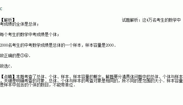 今年我市有4万名学生参加中考,为了了解这些考生的数学成绩,从中抽取2000名考生的数学成绩进行统计分析.在这个问题中,下列说法:①这4万名考生的数学中考成绩的全体是总体;②每个考生是个体;③2000名考生是总体的一个样本;④样本容量是2000.其中说法正确的有()