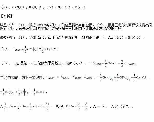 在平面直角坐标系xOy中, A、B两点分别在x轴、y轴的正半轴上,且OB = OA=3.(1)、求点A、B的坐标;(2)、已知点C(-2,2),求△BOC的面积;(3)、点P是第一象限角平分线上一点,若