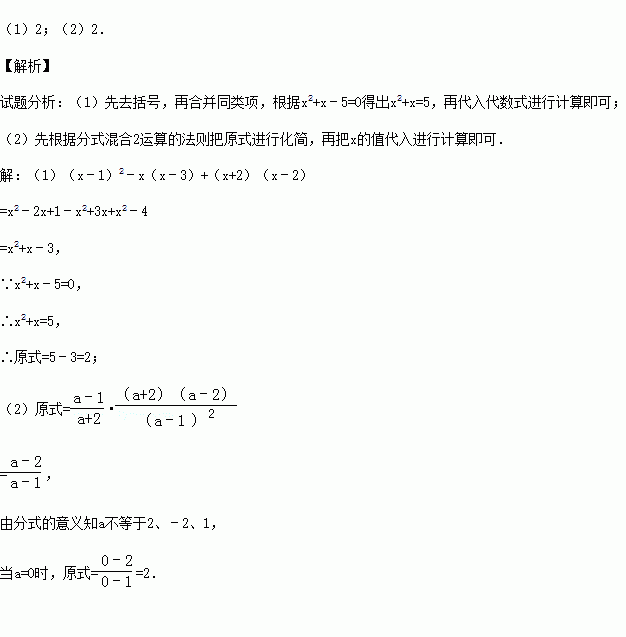 (2015秋•嘉祥县期末)(1)已知x2+x﹣5=0,求代数式(x﹣1)2﹣x(x﹣3)+(x+2)(x﹣2)的值