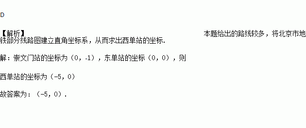 如图,将北京市地铁部分线路图置于正方形网格中,若设定崇文门站的坐标为(0,-1),雍和宫站的坐标为(0,4),则西单站的坐标为( )