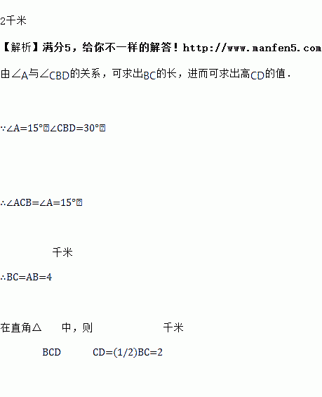 如图,小明在A处看见前面山上有个气象站,仰角为15°,当笔直向山行4千米时,小明看气象站的仰角为30°.你能算处这个气象站离地面的高度CD吗?是多少?.
