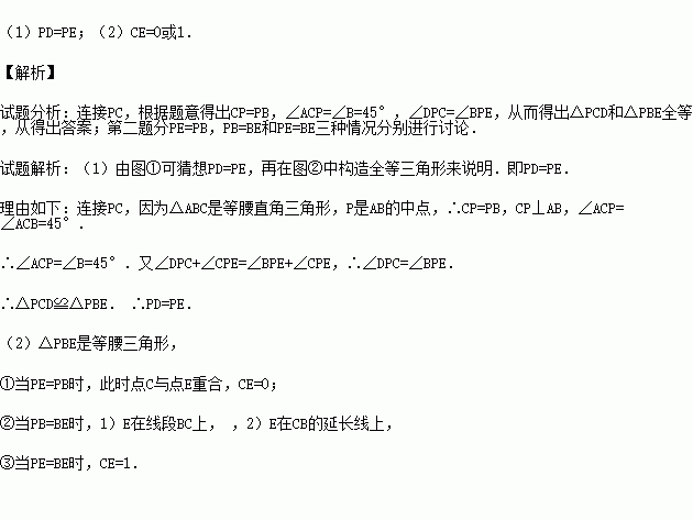 (1)三角板ABC绕点P旋转,观察线段PD和PE之间有什么数量关系?并结合图②加以证明。