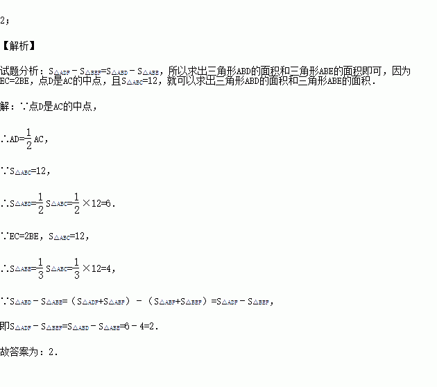 如图,在△ABC中E是BC上的一点,EC=2BE,点D是AC的中点,设△ABC,△ADF,△BEF的面积分别为S△ABC,S△ADF,S△BEF,且S△ABC=12,则S△ADF﹣S△BEF= .