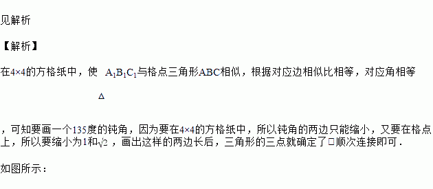 在方格纸中,每个小格的顶点叫做格点,以格点连线为边的三角形叫做格点三角形.如图,请你在4×4的方格纸中,画一个格点三角形A1B1C1,使△A1B1C1与格点三角形ABC相似(相似比不为1).