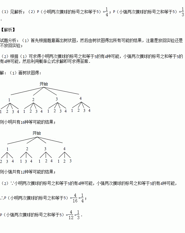 (2)分别求出小明和小强两次摸球的标号之和等于5的概率.