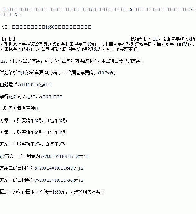 (2)如果每辆轿车的日租金为200元,每辆面包车的日租金为110元,假设新购买的这10辆车每日都可租出,要使这10辆车的日租金不低于1650元,那么应选择以上哪种购买方案?