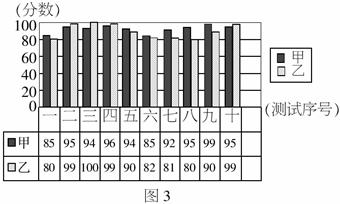 某校为选拨参加2005年全国初中数学竞赛选手,进行了集体培训.在集训期间进行了10次测试,假设其中两位同学的测试成绩如下面的图表(如图3)所示:
