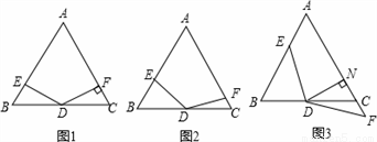 在△ABC中,AB=AC,∠A=60°,点D是线段BC的中点,∠EDF=120°,DE与线段AB相交于点E.DF与线段AC(或AC的延长线)相交于点F.
