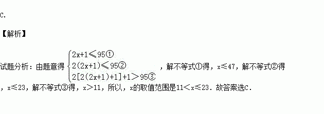 运行程序如图所示,规定:从“输入一个值x”到“结果是否>95”为一次程序操作,如果程序操作进行了三次才停止,那么x的取值范围是( )
