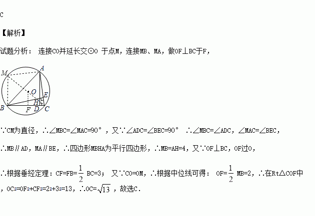 如图,△ABC内接于⊙O,AD⊥BC于点D,BE⊥AC于点E,AD、BE相交于点H.若BC = 6,AH = 4,则⊙O的半径为 ( )