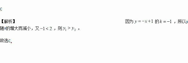 已知P1(﹣1,y1),P2(2,y2)是一次函数y=﹣x+1图象上的两个点,则y1,y2的大小关系是( )