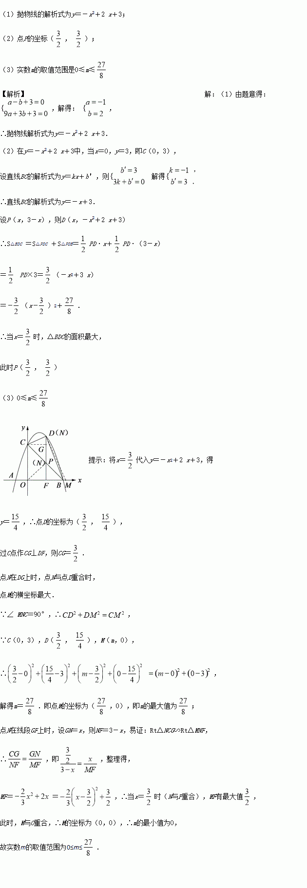 (3)如图2,在(2)的条件下,延长DP交x轴于点F,M(m,0)是x轴上一动点,N 是线段DF上一点,当△BDC的面积最大时,若∠MNC=90°,请直接写出实数m的取值范围.