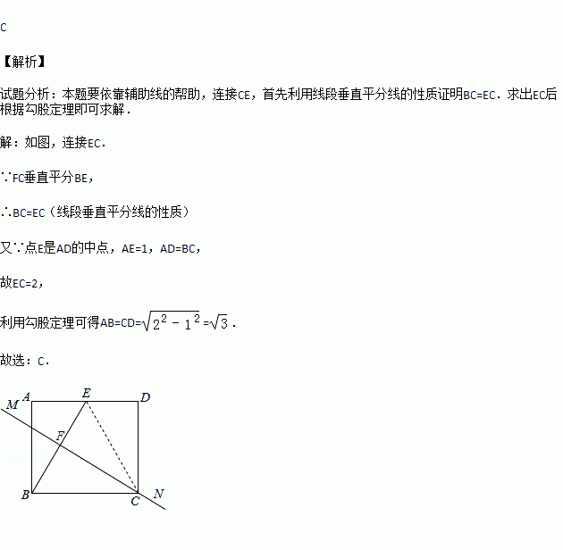 如图,矩形纸片ABCD中,点E是AD的中点,且AE=1,BE的垂直平分线MN恰好过点C.则矩形的一边AB的长度为( )