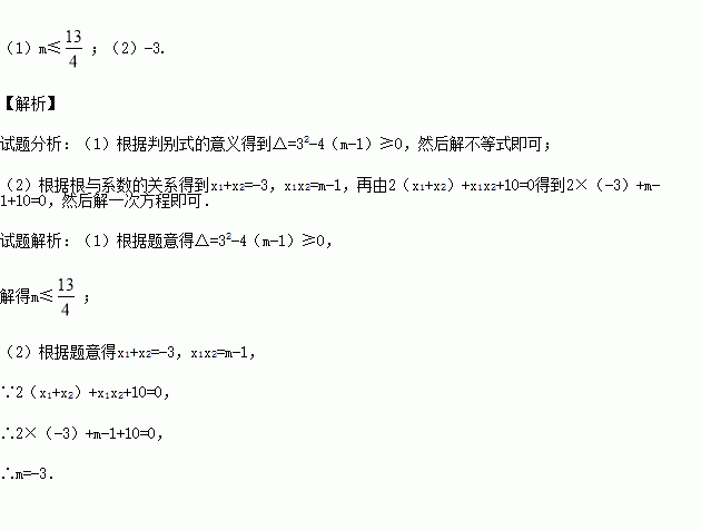 (2)若2(x1+x2)+x1x2+10=0,求m的值.