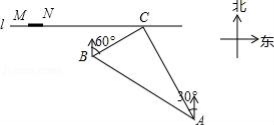 如图,在一条笔直的东西向海岸线l上有一长为1.5km的码头MN和灯塔C,灯塔C距码头的东端N有20km.以轮船以36km/h的速度航行,上午10:00在A处测得灯塔C位于轮船的北偏西30°方向,上午10:40在B处测得灯塔C位于轮船的北偏东60°方向,且与灯塔C相距12km.