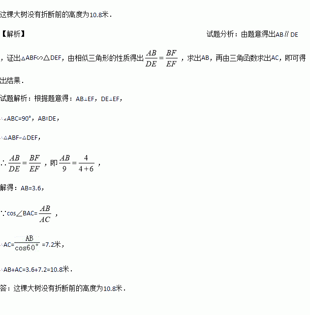 如图,一棵大树在一次强台风中折断倒下,未折断树杆AB与地面仍保持垂直的关系,而折断部分AC与未折断树杆AB形成53°的夹角.树杆AB旁有一座与地面垂直的铁塔DE,测得BE=6米,塔高DE=9米.在某一时刻的太阳照射下,未折断树杆AB落在地面的影子FB长为4米,且点F、B、C、E在同一条直线上,点F、A、D也在同一条直线上.求这棵大树没有折断前的高度.(参考数据:sin53°≈0.8,cos53°≈0.6,tan53°≈1.33)