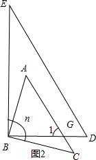 £¨2£©¢ÙÈçͼ2£¬µ±¡÷ABCÐýתÖÁAC¡ÎEDʱ£¬ÉèAC£¬BDÏཻÓÚG£¬ÓÉAC¡ÎED£¬µÃµ½¡Ï1=¡ÏD=60¡ã£¬ÓÉÍâ½ÇµÄÐÔÖʵõ½¡Ï1=¡ÏCBG+¡ÏC£¬ÓÚÊǵõ½¡ÏCBG=¡Ï1-¡ÏC=15¡ã¼´¿ÉµÃµ½n¡ã=90¡ã+¡ÏCBG=90¡ã+15¡ã=105¡ã£»