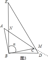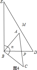 ¢Ú·¢Á½ÖÖÇé¿ö£ºµ±ÐýתÖÁͼ3 µÄλÖÃʱ£¬ÉèACÓëBE½»ÓÚN£¬ÓÉÍâ½ÇµÄÐÔÖʵõ½¡ÏENM=n¡ã+¡ÏBCN=£¨n+45£©¡ã£¬ÓÚÊǵõ½¡ÏAMND=¡ÏEMN+¡ÏE=30¡ã+£¨n+45£©¡ã=£¨n+75£©¡ã£»µ±ÐýתÖÁͼ34µÄλÖÃʱ£¬¸ù¾ÝÍâ½ÇµÄÐÔÖʵõ½¡ÏBPA=¡ÏPBC+¡ÏC£¬ÓÚÊǵõ½¡ÏPBC=£¨n-90£©¡ã£¬ÓÉÍâ½ÇµÄÐÔÖʵõ½¡ÏBPM=¡ÏD+¡ÏAMD£¬¼´¿ÉµÃµ½½áÂÛ¡ÏAMD=¡ÏBPM-¡ÏD=¡ÏBPA-¡ÏD=£¨n-45£©¡ã-60¡ã=£¨n-105£©¡ã£®