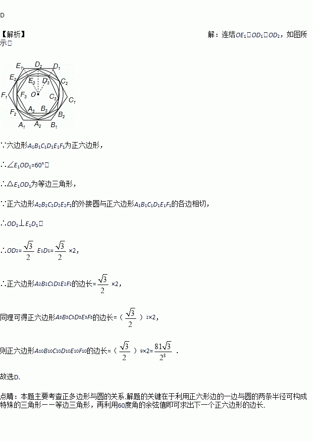 如图,正六边形A1B1C1D1E1F1的边长为2,正六边形A2B2C2D2E2F2的外接圆与正六边形A1B1C1D1E1F1的各边相切,正六边形A3B3C3D3E3F3的外接圆与正六边形A2B2C2D2E2F2的各边相切,…按这样的规律进行下去,A10B10C10D10E10F10的边长为( )