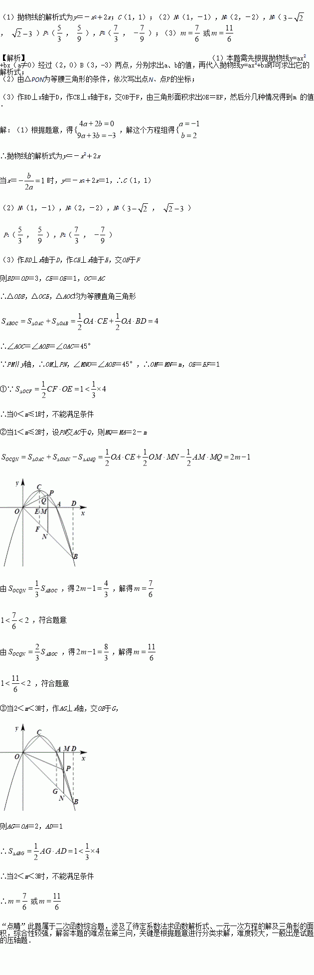 如图,抛物线y=ax2+bx经过A(2,0),B(3,-3)两点,抛物线的顶点为C,动点P在直线OB上方的抛物线上,过点P作直线PM∥y轴,交x轴于M,交OB于N,设点P的横坐标为m.