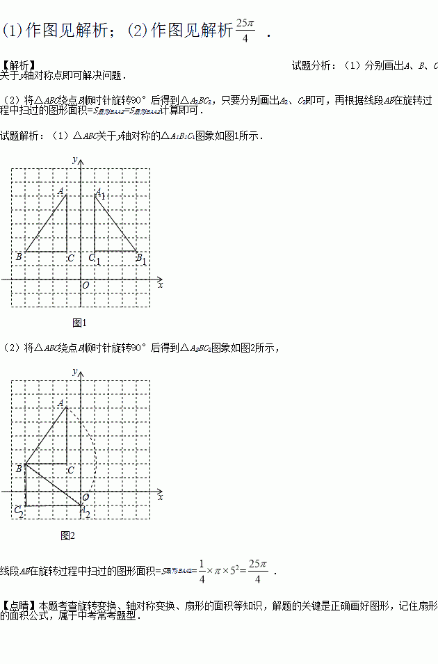 (2)将△ABC绕点B顺时针旋转90°后得到△A2BC2,请画出△A2BC2,并求出线段AB在旋转过程中扫过的图形面积(结果保留π).