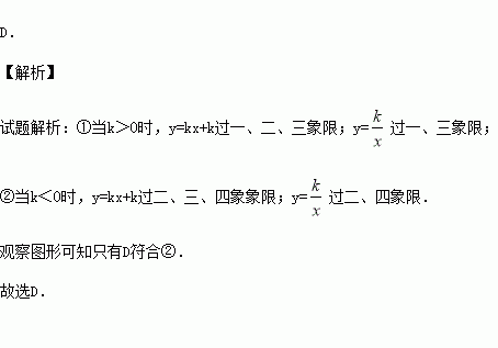 如图,反比例函数y=(k≠0)与一次函数y=kx+k(k≠0)在同一平面直角坐标系内的图象可能是( )