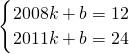 解:(1)设y=kx+b,将点(2008,12)、(2011,24)代入可得: