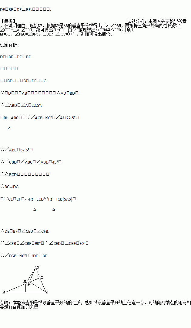 如图,在Rt△ABC中,∠ACB=90°,∠A=22.5°,斜边AB的垂直平分线交AC于点D,点F在AC上,点E在BC的延长线上,CE=CF,连接BF,DE.线段DE和BF在数量和位置上有什么关系?并说明理由.