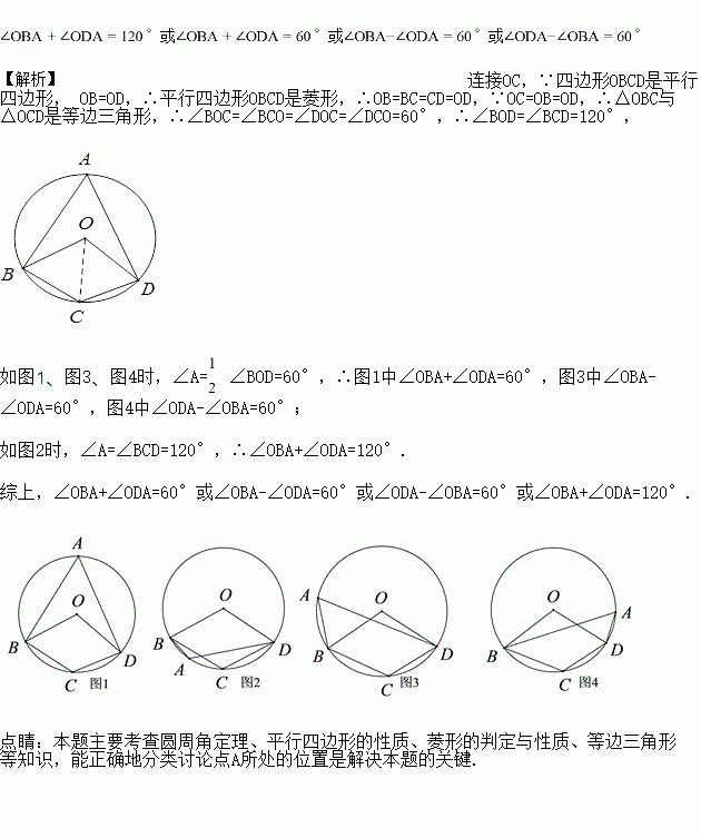四边形OBCD中的三个顶点在⊙O上,点A是⊙O上的一个动点(不与点B、C、D重合)。若四边形OBCD是平行四边形时,那么