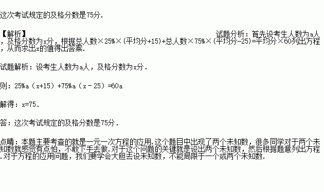 一次选拔考试的及格率为25%,及格者的平均分数比规定的及格分数多15分,不及格者的平均分数比规定的及格分数少25分,又知全体考生的平均分数是60分,求这次考试规定的及格分数是多少?