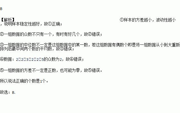 下列说法中:①样本中的方差越小,波动越小,说明样本稳定性越好;②一组数据的众数只有一个;③一组数据的中位数一定是这组数据中的某一个数据;④数据3,3,3,3,2,5中的众数为4;⑤一组数据的方差一定是正数.其中正确的个数为( )